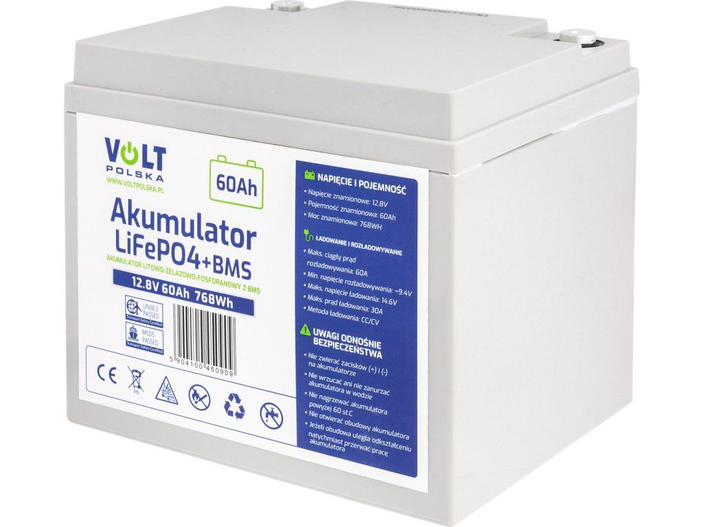 Hľadáte spoľahlivý a výkonný akumulátor s dlhou životnosťou? LiFePO4 akumulátor 12V 60Ah od Volt Polska je ideálnym riešením pre širokú škálu aplikácií. Vďaka svojej nízkej hmotnosti a vysokej cyklickej životnosti (až 6000 cyklov ) je perfektnou voľbou pre karavany, obytné vozy, lode, off-grid systémy a záložné zdroje energie. Vysokokapacitný LiFePO4 akumulátor s nominálnym napätím 12,8V a kapacitou 60Ah predstavuje špičkové riešenie pre náročné energetické aplikácie. Tento lítium-železo-fosfátový akumulátor novej generácie je vybavený vstavaným BMS (Battery Management System).