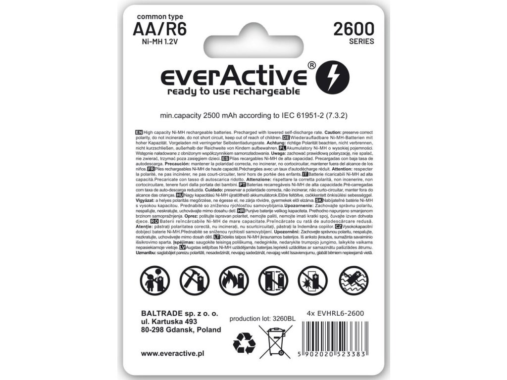 4x Nabíjateľne batérie AA / R6 everActive Ni-MH 2600 mAh pripravené na použitie