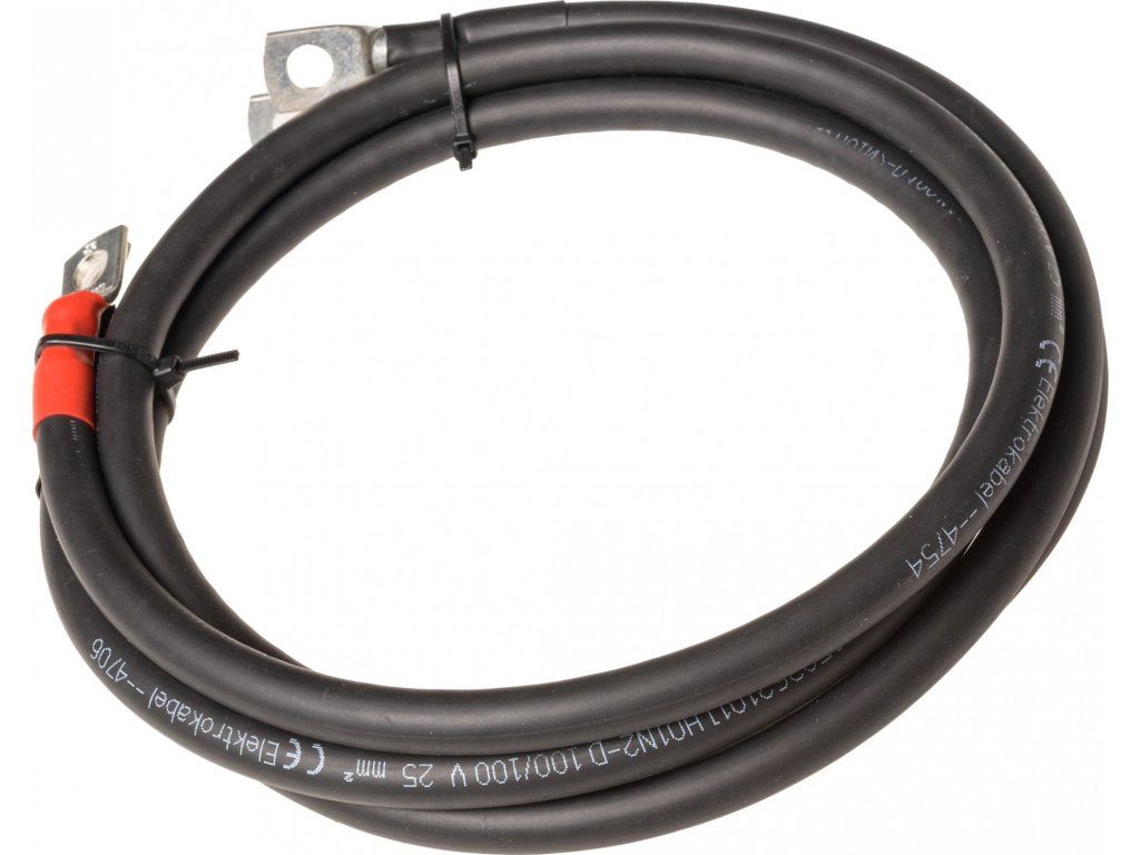 Dĺžka a Rozmer: Tento kábel na pripojenie batérií má dĺžku 100 cm a prierez 25mm2, čo zabezpečuje optimálny prenos prúdu medzi batériami. Prípojné body sú vybavené M8 koncovkami pre jednoduchú a bezpečnú inštaláciu.