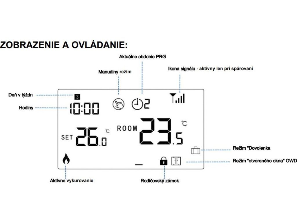 Keď je v nastaveniach povolená detekcia otvoreného okna, zariadenie automaticky vypne kúrenie, keď zaznamená náhly pokles teploty (štandardne 2°C do 15 minút). Toto je správna reakcia termostatu na situáciu, keď sa otvorí okno/dvere bez vypnutia kúrenia. Zariadenie sa vráti do normálneho režimu po 30 minútach. Stlačením ľubovoľného tlačidla v režime OWD sa okamžite vypne.
