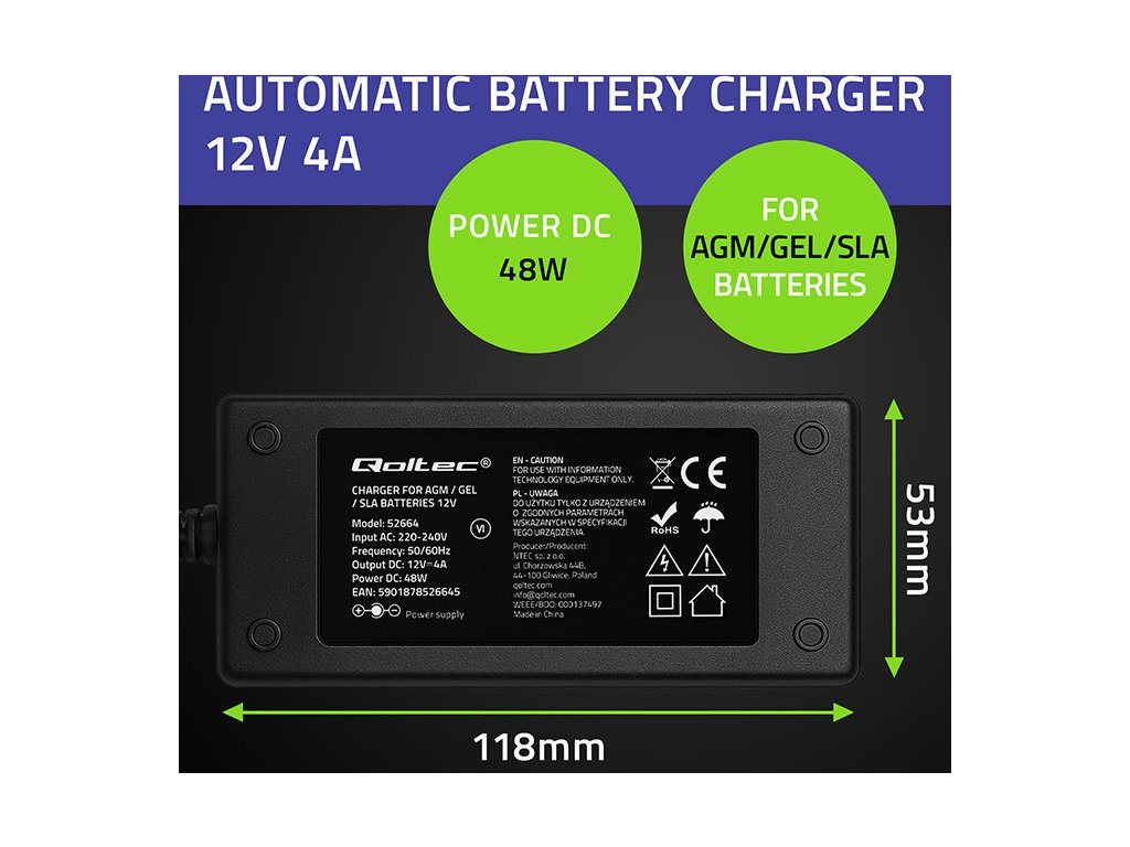 Výber správnej nabíjačky pre vašu batériu je kľúčový, ak chcete, aby vaša batéria vydržala dlho. Nesprávna nabíjačka môže viesť nielen k dlhším časom nabíjania, ale aj k výraznému skráteniu jej životnosti. Nabíjačka Qoltec ponúka presné nabíjanie založené na mikroprocesore, jednu nabíjačku pre olovené, AGM, GEL a STD batérie– ideálne pre motocykle, štvorkolky, kosačky na trávu, elektrické hračky a núdzové systémy.