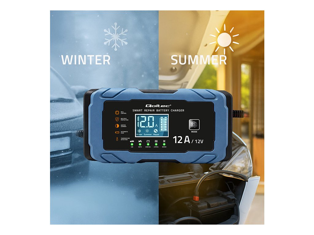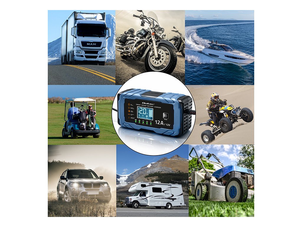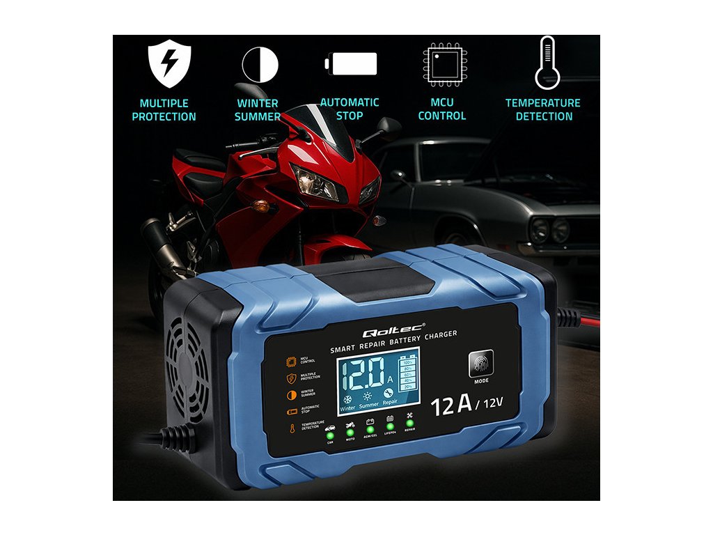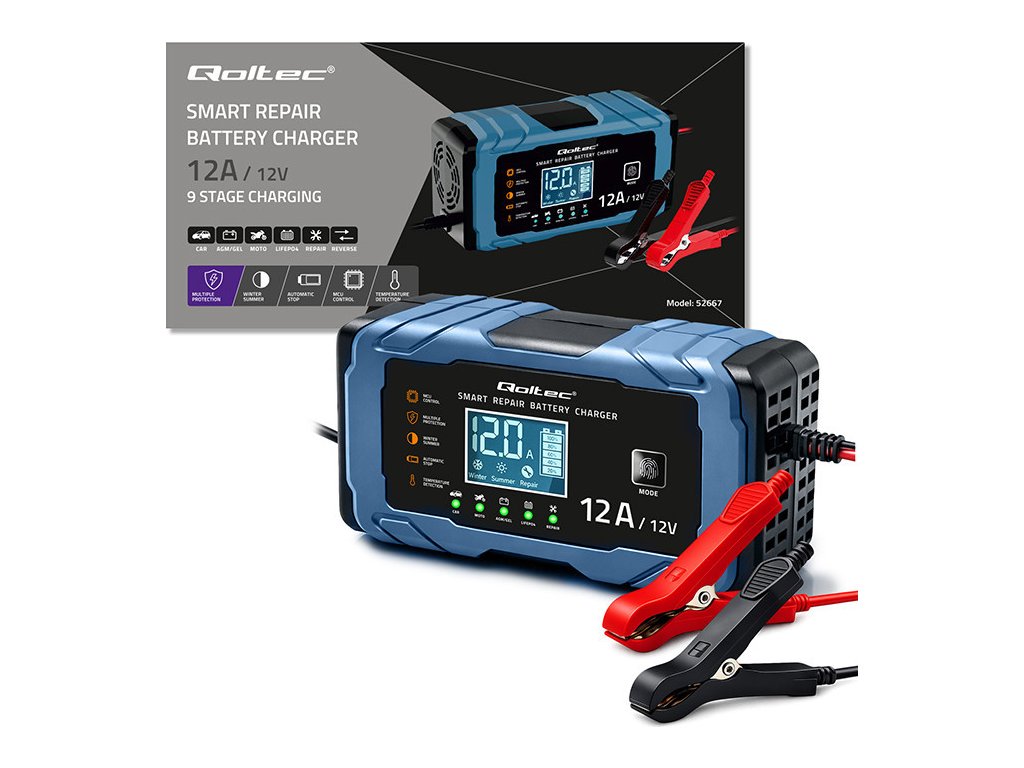Nabíjačka Qoltec ponúka presné nabíjanie založené na mikroprocesore ; jedna nabíjačka je dostatočná pre rôzne typy batérií. Čas potrebný na nabíjanie závisí od stupňa vybitia batérie a jej skutočnej kapacity . Nabíjačka je určená na nabíjanie batérií v automobiloch, motocykloch, lodiach, kosačkách na trávu, poľnohospodárskych vozidlách a štvorkolkách.