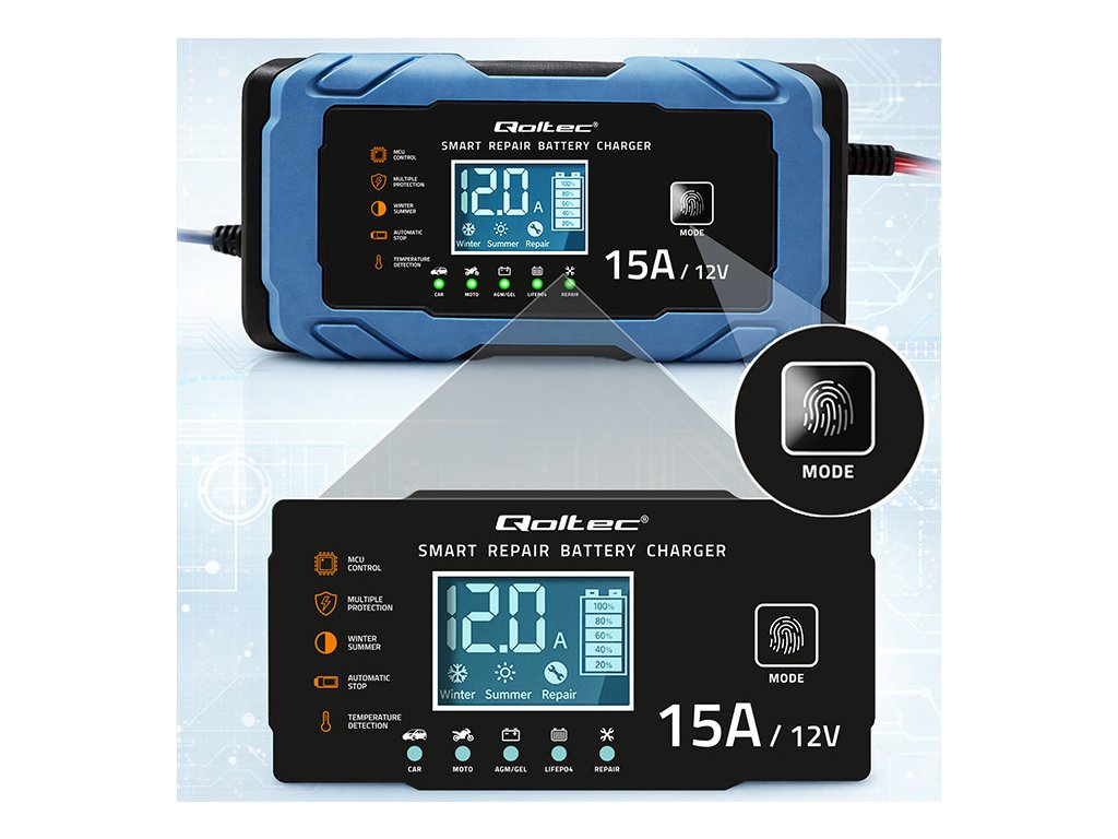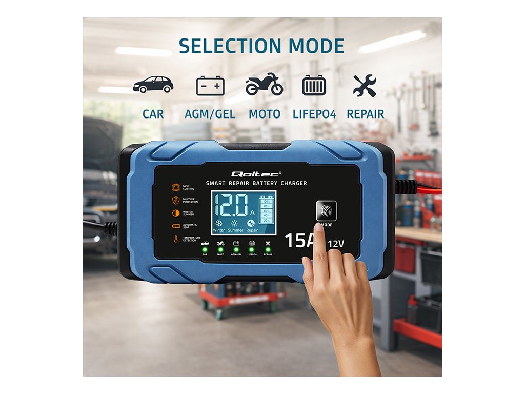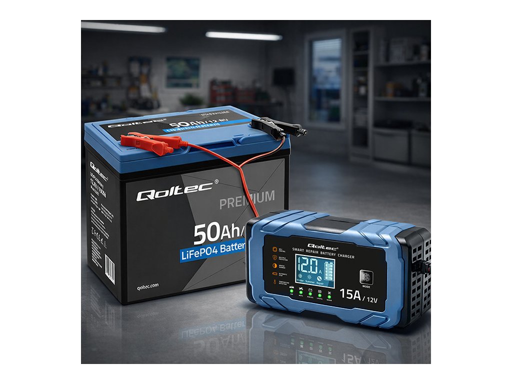Nabíjačka Qoltec ponúka presné nabíjanie založené na mikroprocesore ; jedna nabíjačka je dostatočná pre rôzne typy batérií. Čas potrebný na nabíjanie závisí od stupňa vybitia batérie a jej skutočnej kapacity . Nabíjačka je určená na nabíjanie batérií v automobiloch, motocykloch, lodiach, kosačkách na trávu, poľnohospodárskych vozidlách a štvorkolkách.