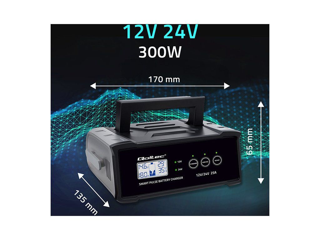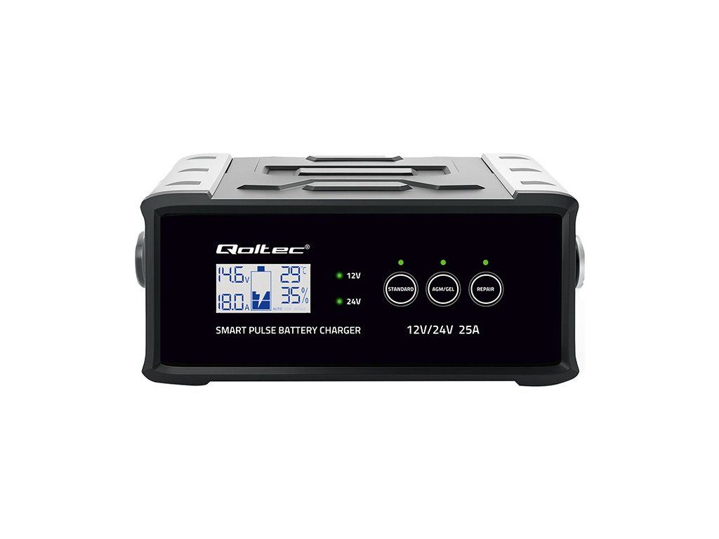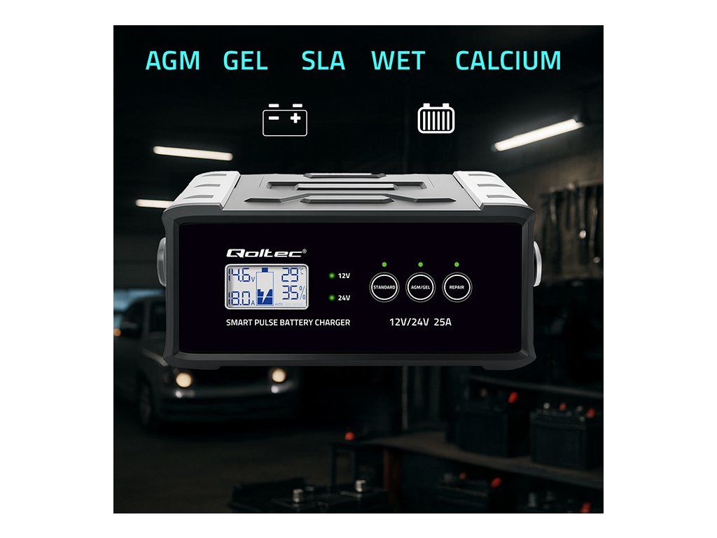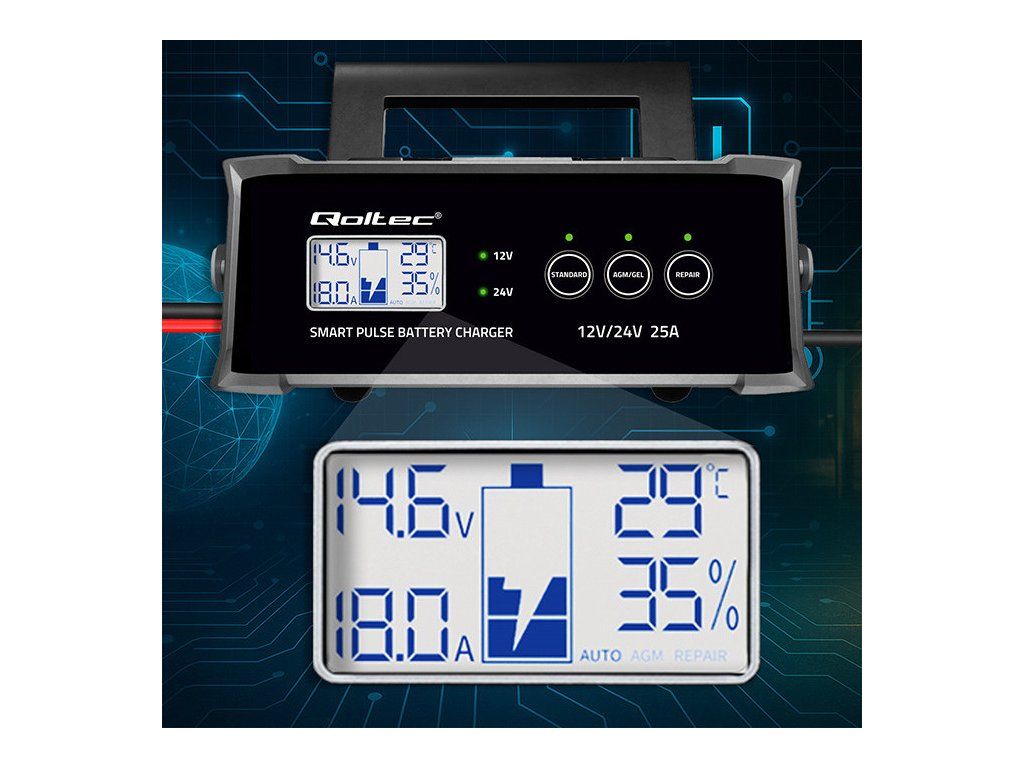 Inteligentná mikroprocesorová nabíjačka Qoltec 12V 24V 25A | Usmerňovač s funkciou opravy pre AGM GEL SLA batérie | LCD