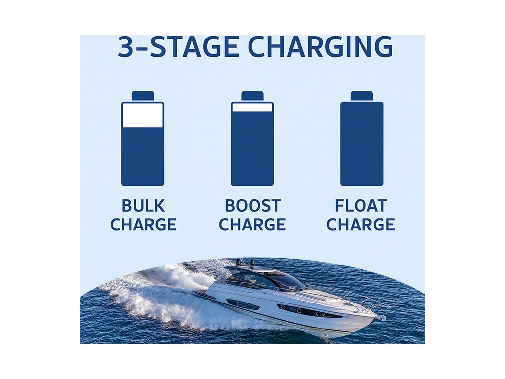 Inteligentná nabíjačka Monolith nabije vašu batériu pomocou inteligentného 3-stupňového nabíjania, ktoré prispôsobuje nabíjacie napätie a prúd aktuálnej úrovni nabitia batérie a pozostáva z 3 stupňov:
