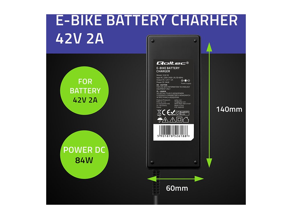 Táto mobilná nabíjačka Qoltec s napätím 42 V, nabíjacím prúdom 2 A, zástrčkou 3P-GX16 a celkovým nabíjacím výkonom 84 W, určená pre 36 V lítium-iónové batérie , vám umožňuje nabíjať batériu z akejkoľvek elektrickej zásuvky 230 V. Toto pohodlné a funkčné riešenie s pokročilou elektronikou chráni vašu batériu počas procesu nabíjania.
