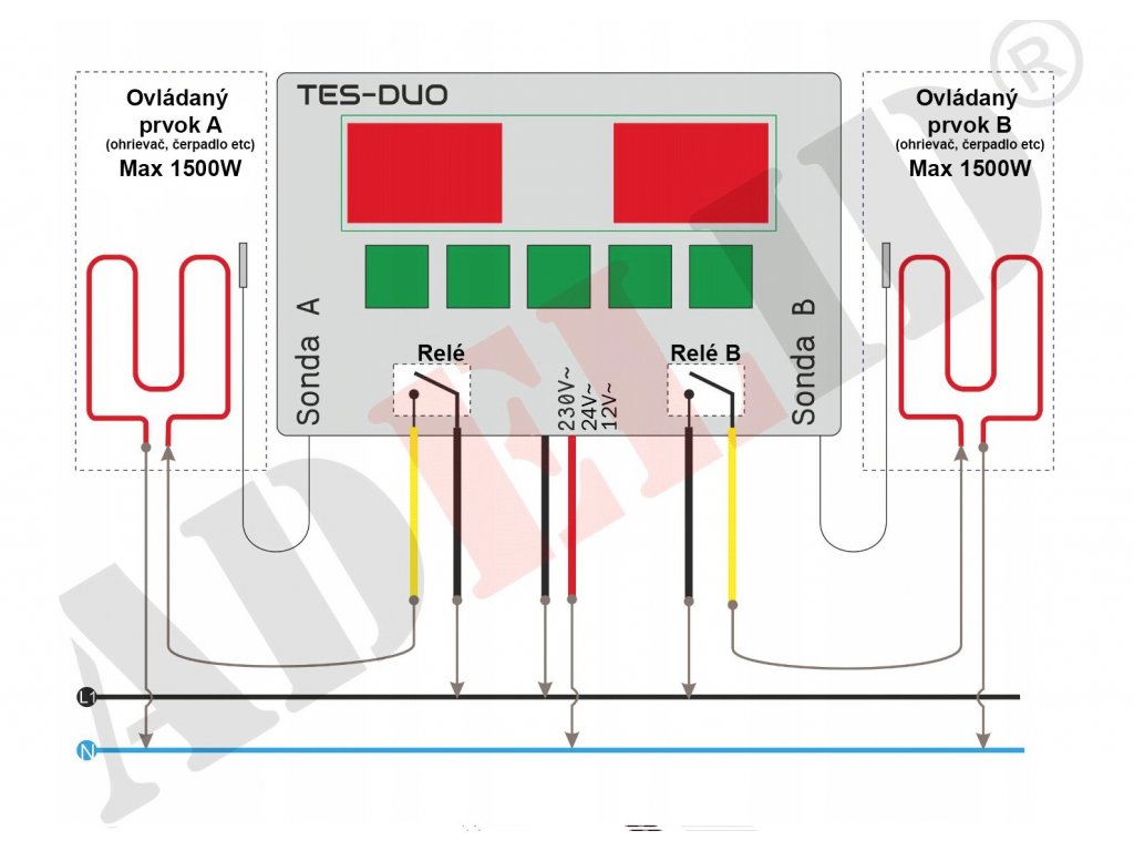| LED diódy: | indikujú aktiváciu relé a aktivovaný alarm, Zabudovaná pamäť nastavení: pri výpadku prúdu nie je potrebné zariadenie znova programovať. |