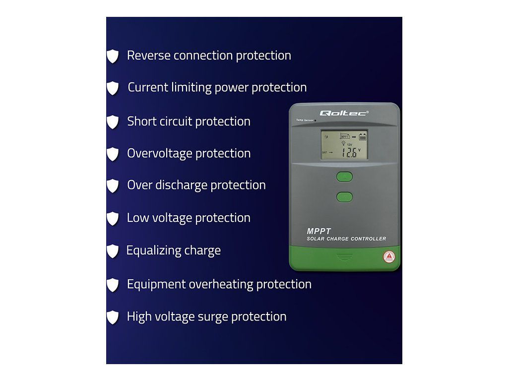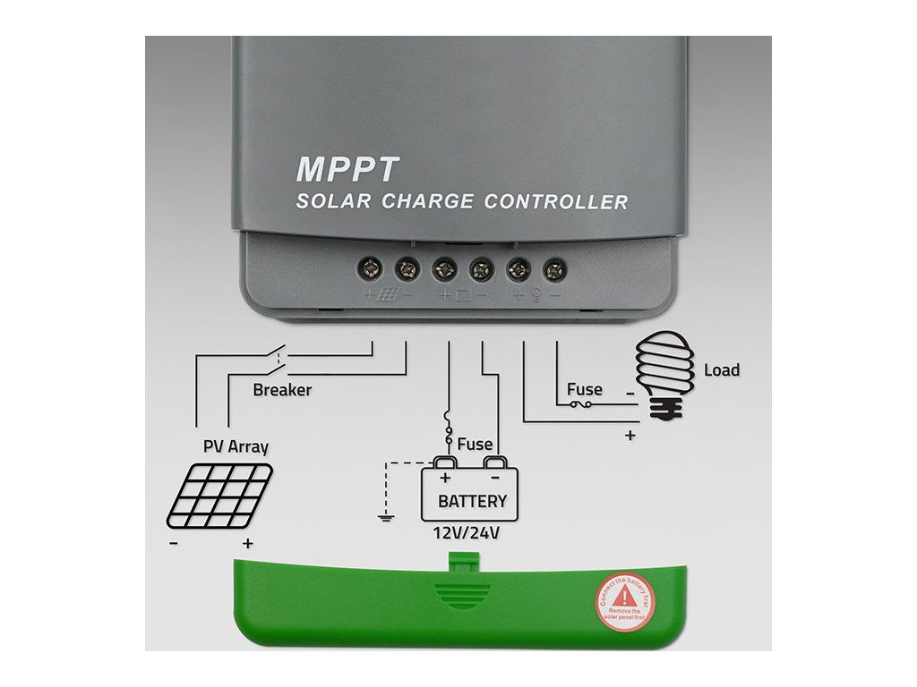 • Vybavené obvodom na detekciu polarity , ktorý kontroluje, či sú vodiče solárneho panela správne pripojené