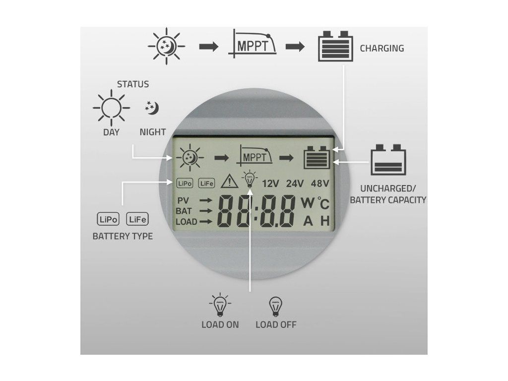 Produkt je vybavený pokročilým LCD displejom a pripojením Bluetooth, ktoré používateľom poskytujú úplnú kontrolu a prehľadnosť nad prevádzkou systému. Intuitívne menu displeja zjednodušuje konfiguráciu a prispôsobenie nastavení individuálnym potrebám používateľa . Displej zobrazuje aktuálne prevádzkové parametre, čo umožňuje priebežné monitorovanie výkonu systému. Vďaka externému teplotnému senzoru a pripojení Bluetooth môžete na diaľku monitorovať stav systému prostredníctvom mobilnej aplikácie a zároveň chrániť batériu pred prebitím alebo prehriatím . Používatelia môžu rýchlo skontrolovať aktuálny prevádzkový stav a dostávať informácie o akýchkoľvek chybách alebo alarmoch.