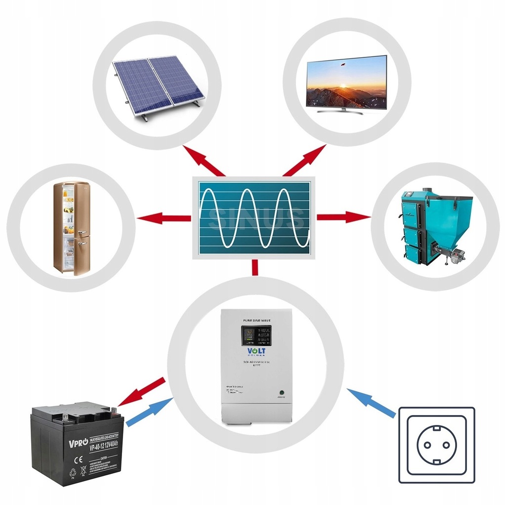 Núdzový zdroj SinusPRO 7000S 48V slúži na napájanie elektrických zariadení vyžadujúcich striedavé napätie 230V zo 48V jednosmerných batérií.