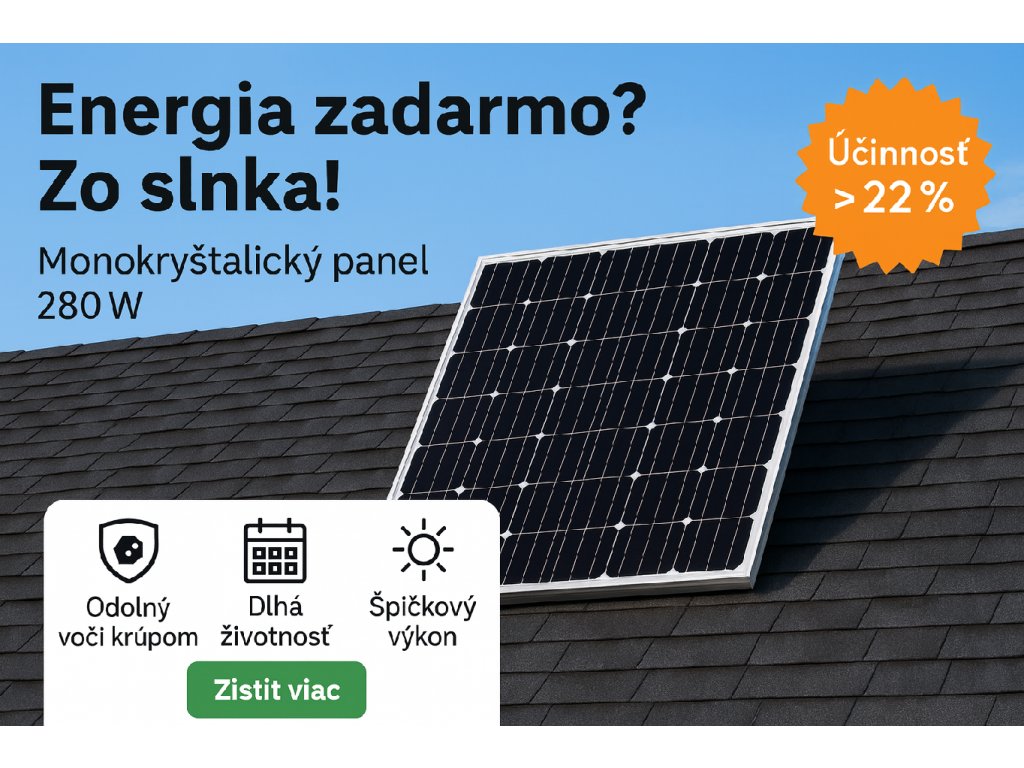 Využite slnko naplno s naším 280W monokryštalickým panelom. Ponúka špičkovú účinnosť až 22 %, certifikovanú odolnosť voči nepriaznivému počasiu, vysoký a stabilný výkon vďaka modernej MONO technológii a flexibilné použitie pre rodinné domy, chaty aj karavany. Investícia, ktorá sa vám vráti.