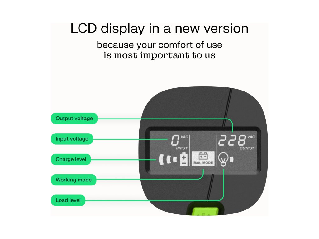 UPS je vybavený LCD displejom, ktorý poskytuje informácie o mnohých dôležitých prevádzkových parametroch, ako aj špeciálnou aplikáciou, ktorá zjednodušuje používanie a monitorovanie. V novej verzii UPS sme vylepšili a znížili jas obrazovky, aby bola čo najčitateľnejšia.
